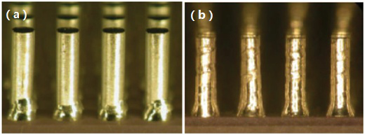 圖 9. 焊柱失效模式圖 (a). 普通錫柱 (b). 螺旋錫柱