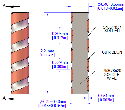 圖3為一種常用規(guī)格螺旋錫柱及其截面示意圖。中心為80Pb/20Sn錫絲,表面繞厚度為0.051mm的銅箔,然后整體覆一層63Sn/37Pb共晶焊料將錫柱包裹。
