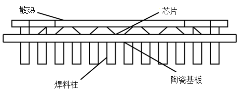 CCGA器件的封裝結(jié)構(gòu)(如圖4)大體由三部分組成:底部是高鉛含量的焊柱陣列,中部為陶瓷基板,集成電路芯片則置于基板頂部,且多采用倒裝形式,這種形式縮短了信號(hào)通路,降低了寄生效應(yīng),使信號(hào)速度和品質(zhì)得到提高。