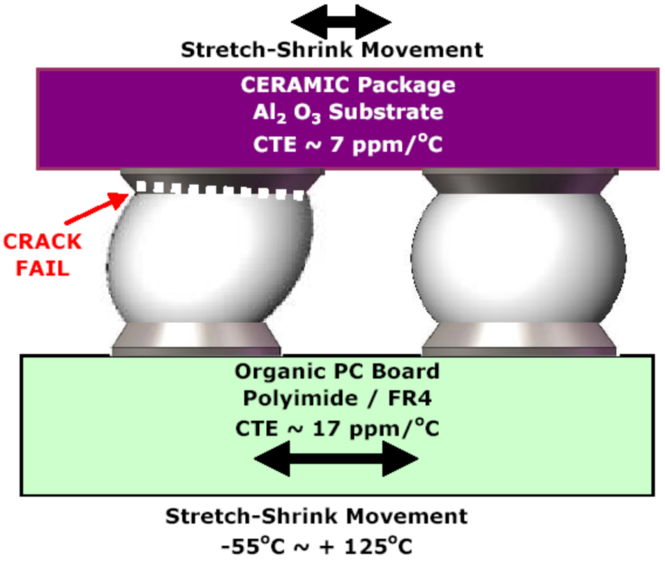 圖6、7、8分別為錫球、普通錫柱、螺旋錫柱大溫度波動(dòng)測(cè)試結(jié)果(產(chǎn)生陶瓷柱柵陣列和PCB板間的剪切應(yīng)力)(熱膨脹系數(shù)失配度~10 ppm/oC)。可以看出,錫球?qū)μ沾苫搴?/font>PCB之間因CTE不匹配而產(chǎn)生的應(yīng)力適應(yīng)力較差,焊點(diǎn)出現(xiàn)了坍塌。CCGA因連接高度增加后,焊點(diǎn)上的應(yīng)力將通過(guò)焊柱的彎曲來(lái)進(jìn)行釋放,從而能更好地適應(yīng)陶瓷基板和PCB之間因CTE不匹配而產(chǎn)生的應(yīng)力。而螺旋錫柱較普通錫柱傾斜度更小,對(duì)此剪切應(yīng)力的吸收能力更強(qiáng),具有更好的支撐能力。